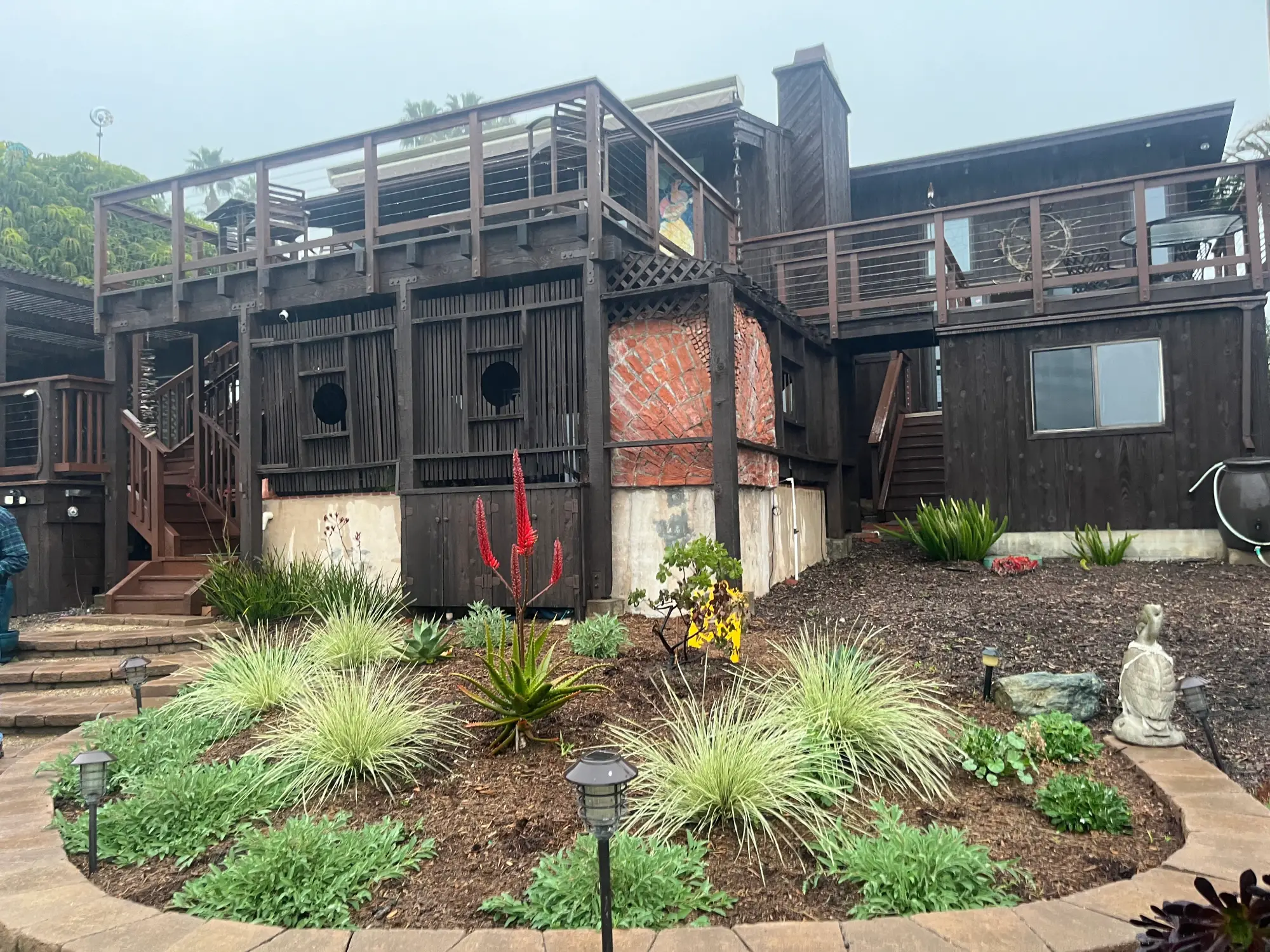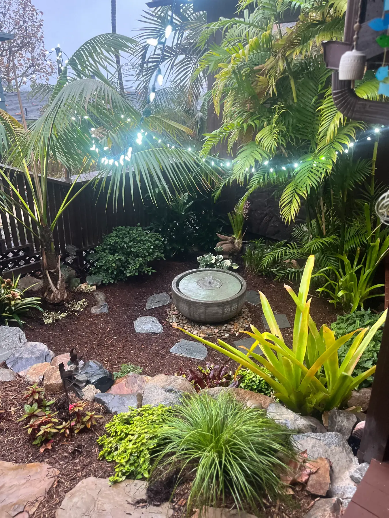 Front view of Leucadia backyard featuring lush planting enhancement, stone water feature, and natural flagstone pathway.