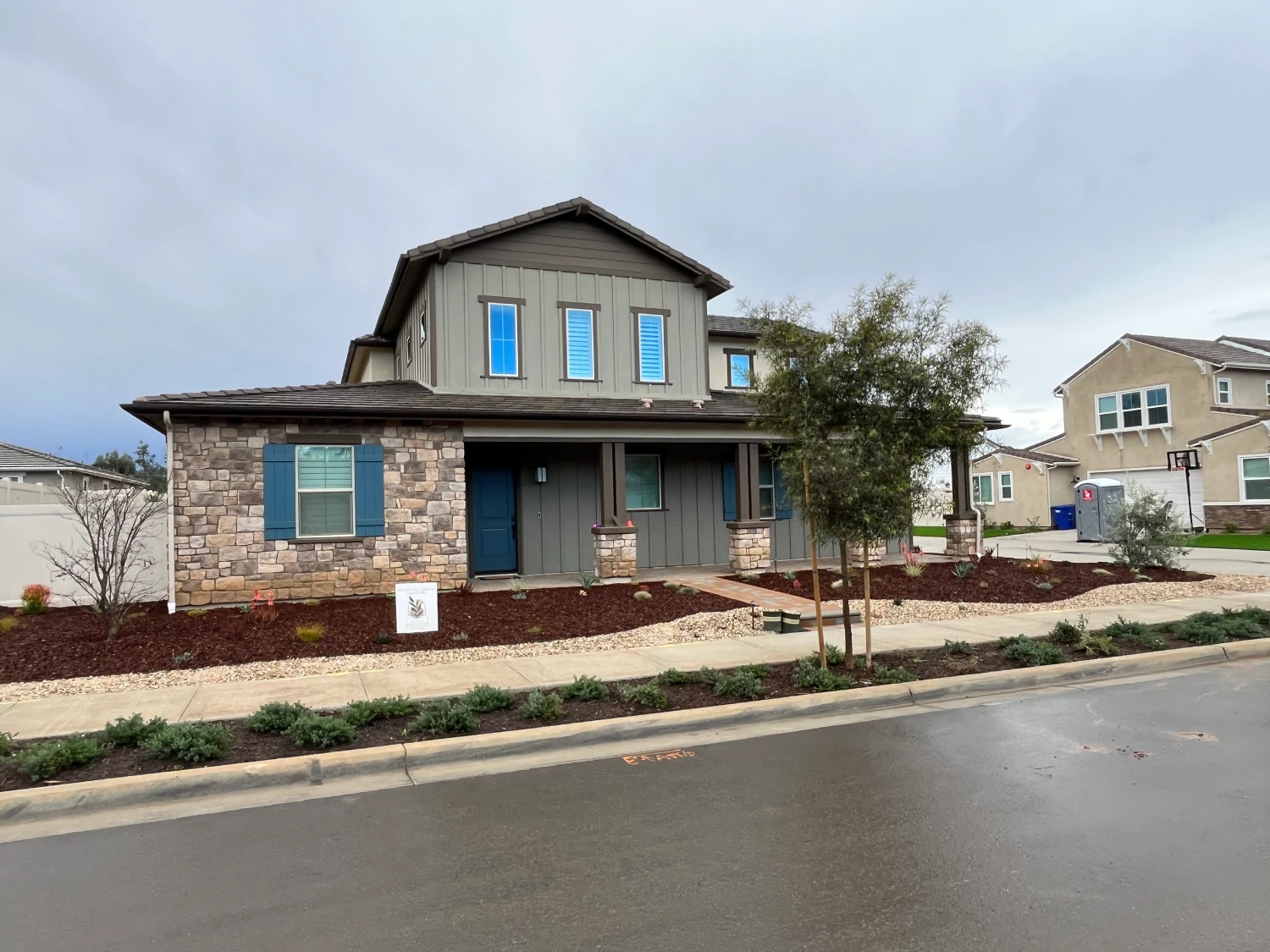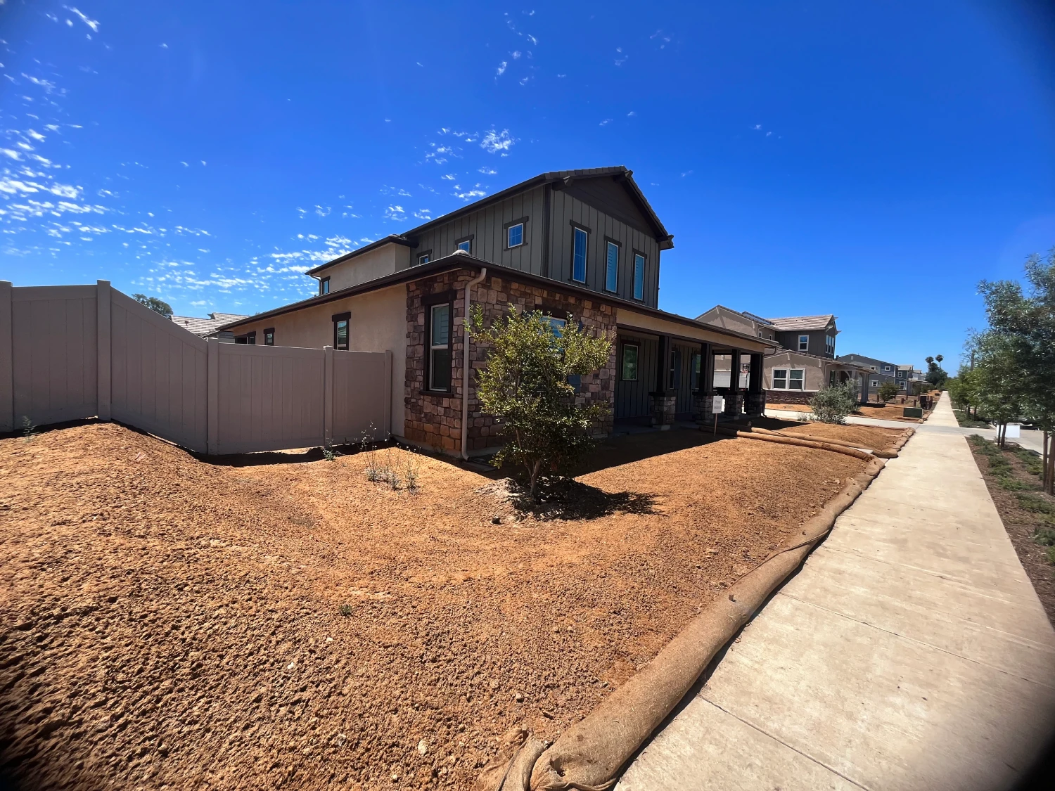 Angled view showing the finished front yard design and how it enhances the curb appeal of the home