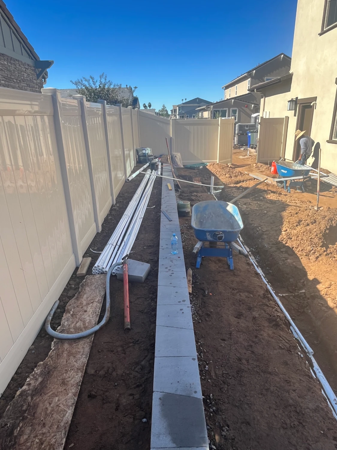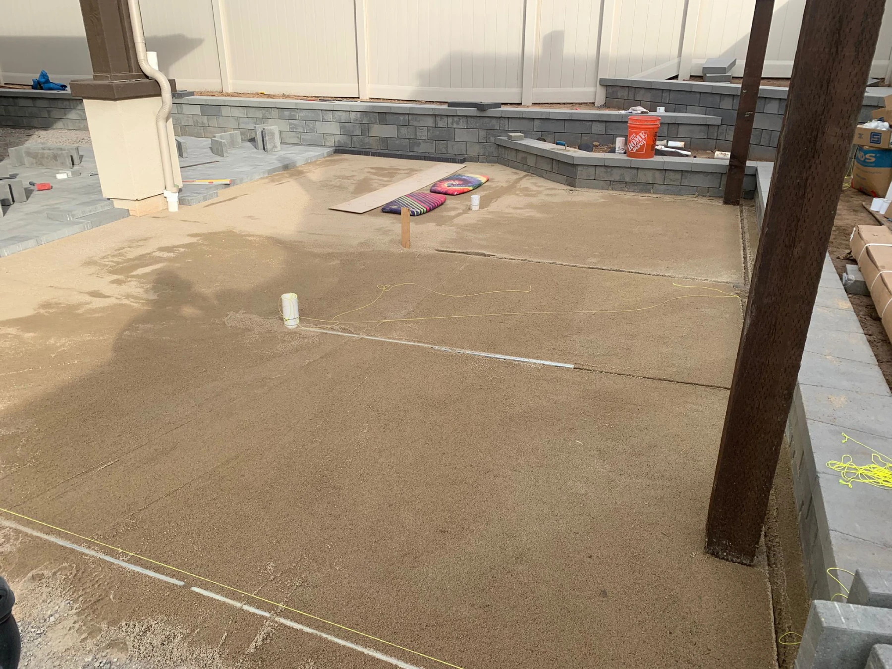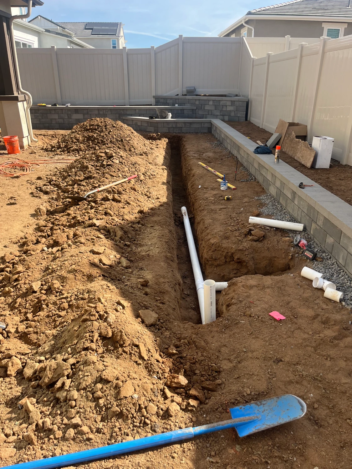 Finished pipe installation secured under a fresh concrete layer during Poway landscaping work