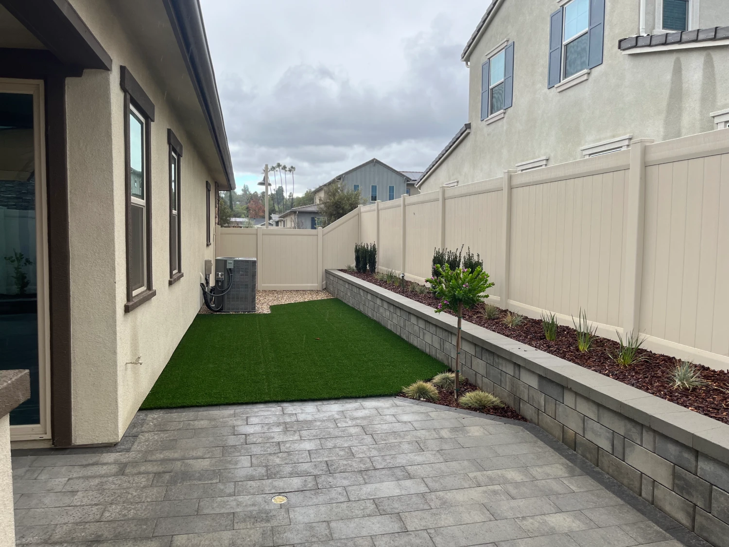 Backyard transformation featuring a modern paver patio, lush synthetic turf, and modular block wall